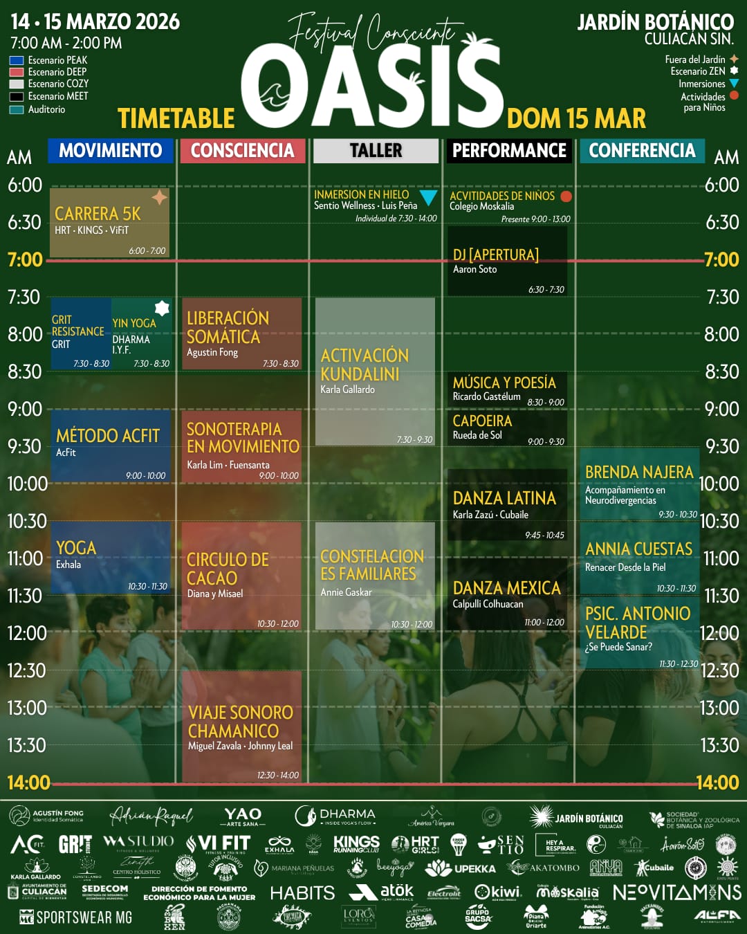 Culiacán, Sinaloa a 07 de marzo de 2026.- Durante el 14 y el 15 de marzo podrás conocer, probar y adoptar prácticas de autocuidado físico y emocional en el OASIS Festival Consciente 2026, actividades que se realizarán en el Jardín Botánico Culiacán, con la colaboración del Ayuntamiento de Culiacán y de diversos patrocinadores.